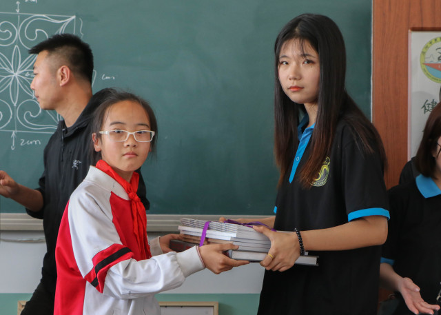 在五月十六日上午志愿团到达黑岛镇中心小学,与校长和老师交流后,我们向黑岛小学赠送了美术作品及书籍,并进行了现场作画,送给了孩子们。