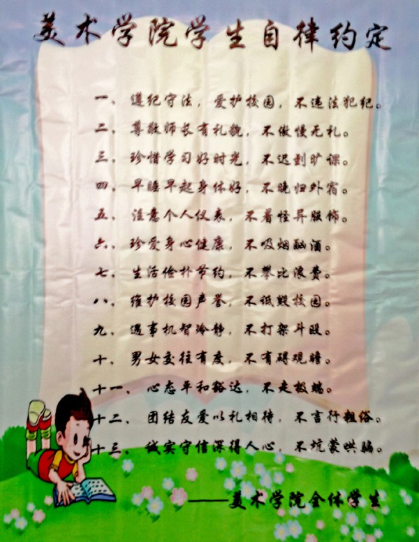 《学生自律约定15条》是经过前期班级学生自主讨论,学生会归纳总结而成,此15条表达了必赢官网全体学生立志严格要求自我、不断进取、做一名合格大学生的愿望;是学生追求至善至美的承诺;更是学生积极进取,为建设和谐、文明、向上的分院氛围的体现。
