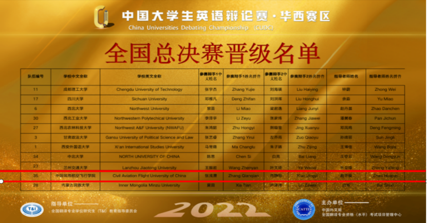 10月15-16日,由全国翻译专业学位研究生教育指导委员会指导、中国外文局CATTI项目管理中心主办的2022年中国大学生英语辩论赛(CUDC)华西大区赛在线上举行。本次大赛共有来自四川大学、西安交通大学、四川外国语大学等高校的60余支队伍参赛。经过两天激烈角逐,我校bat365正版唯一官网英语专业2021级学生张浅潜和肖静怡组成的代表队在赵华俊老师的带领下荣获华西赛区一等奖,并顺利晋级全国总决赛。