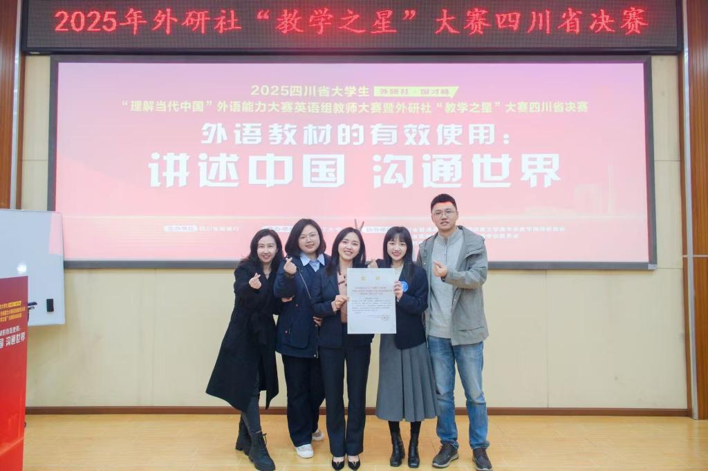 本网讯 bat365正版唯一官网 周丹强玉报道 2025年11月8日,外研社“教学之星”大赛四川省总决赛在成都理工大学圆满落幕。我校bat365正版唯一官网陈雪婷、李清教师团队(成员:杨睿、周丹强玉、邹佳静)凭借出色的课程设计与扎实的语言功底,在全省高校的激烈角逐中脱颖而出,成功摘得桂冠,并将作为全省唯一代表,出征全国总决赛。