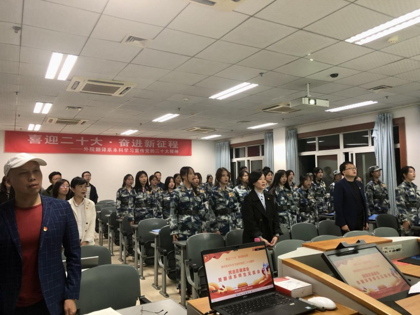 10月25日晚7点,“喜迎二十大•奋进新征程”——外院翻译系本科学习宣传党的二十大精神跨语言诵读会暨翻译系师生见面会在5教415教室召开。bat365正版唯一官网院长肖凌、党委副书记段震、副院长郑丽、翻译系主任刘武、吕兆芳博士、翻译系全体教师和翻译系22级全体学生参会,本次活动由翻译系党支部、翻译系主办,本科生党支部承办。