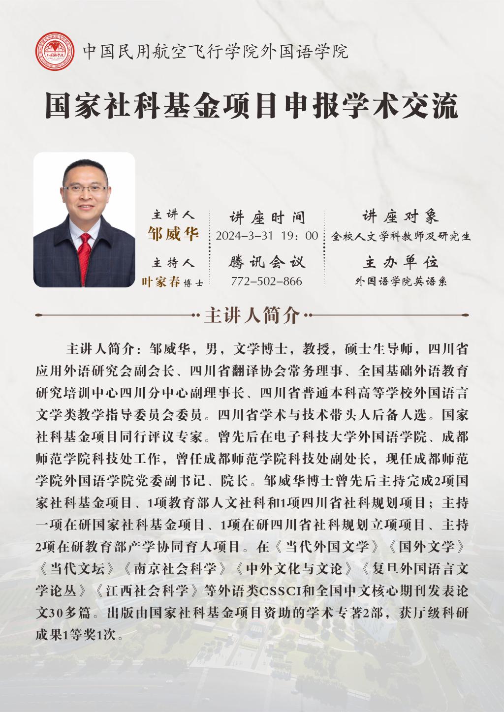 主讲人简介:邹威华,男,文学博士,教授,硕士生导师,四川省应用外语研究会副会长、四川省翻译协会常务理事、全国基础外语教育研究培训中心四川分中心副理事长、四川省普通本科高等学校外国语言文学类教学指导委员会委员。四川省学术与技术带头人后备人选。国家社科基金项目同行评议专家。曾先后在电子科技大学bat365正版唯一官网、成都师范学院科技处工作,曾任成都师范学院科技处副处长,现任成都师范学院bat365正版唯一官网党委副书记、院长。邹威华博士曾先后主持完成2项国家社科基金项目、1项教育部人文社科和1项四川省社科规划项目;主持一项在研国家社科基金项目、1项在研四川省社科规划立项项目、主持2项在研教育部产学协同育人项目。在《当代外国文学》《国外文学》《当代文坛》《南京社会科学》《中外文化与文论》《复旦外国语言文学论丛》《江西社会科学》等外语类CSSCI和全国中文核心期刊发表论文30多篇。出版由国家社科基金项目资助的学术专著2部,获厅级科研成果1等奖1次。
