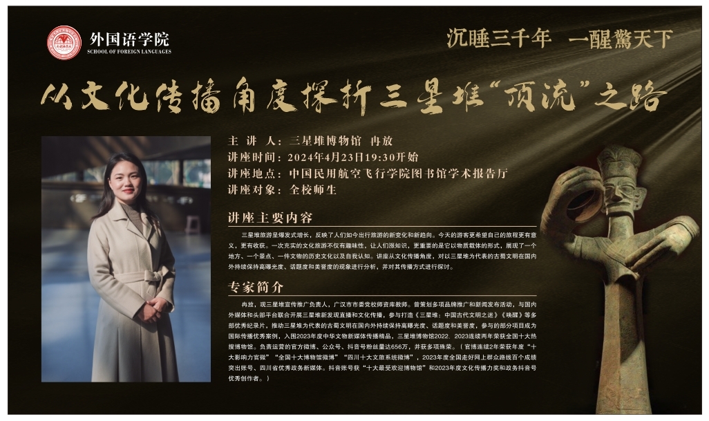 三星堆为什么这么火?顶流幕后有哪些秘笈?2024年4月23日晚19:30分,bat365正版唯一官网邀请三星堆博物馆宣传部冉放部长在图书馆一楼报告厅为全校师生带来了一场生动有趣的三星堆文化讲座,讲述三星堆文化传播成功背后的真实故事。