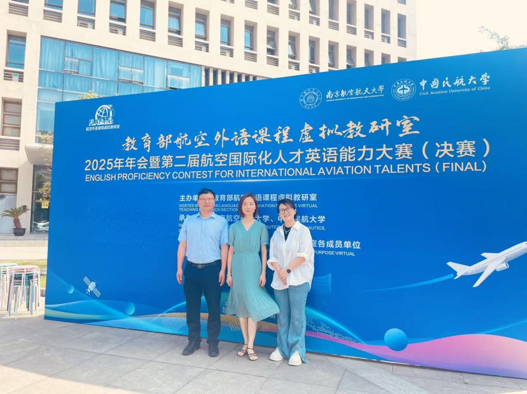 本网讯 bat365正版唯一官网 丁琳报道:为深化航空外语教学改革,推动航空国际化人才培养,bat365正版唯一官网陈华妮副院长、李君华和丁琳老师于5月16日至18日应邀赴江苏南京,参加由教育部航空外语课程虚拟教研室主办,南京航空航天大学与中国民航大学承办的“教育部航空外语课程虚拟教研室2025年年会暨第二届航空国际化人才英语能力大赛(决赛)”。来自全国多所高校的专家学者齐聚一堂,围绕航空英语教学创新、测试体系优化及国际化人才培养等议题展开深入交流。