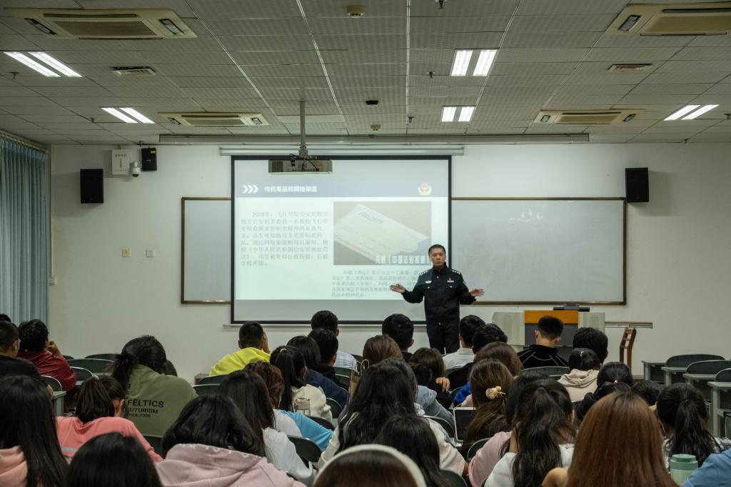 了解违法犯罪条例,提高法治意识。曾警官从正当防卫、防范盗窃、远离黄赌毒三个方面分别介绍了相关法律法规,同时结合真实案例,以案释法,破除学生对正当防卫及打架斗殴的理解误区。加强学生对宿舍盗窃的自我防范意识,强调抵制不良诱惑、远离混乱场所的必要性。呼吁同学们知法、懂法、守法,避免触碰法律红线。