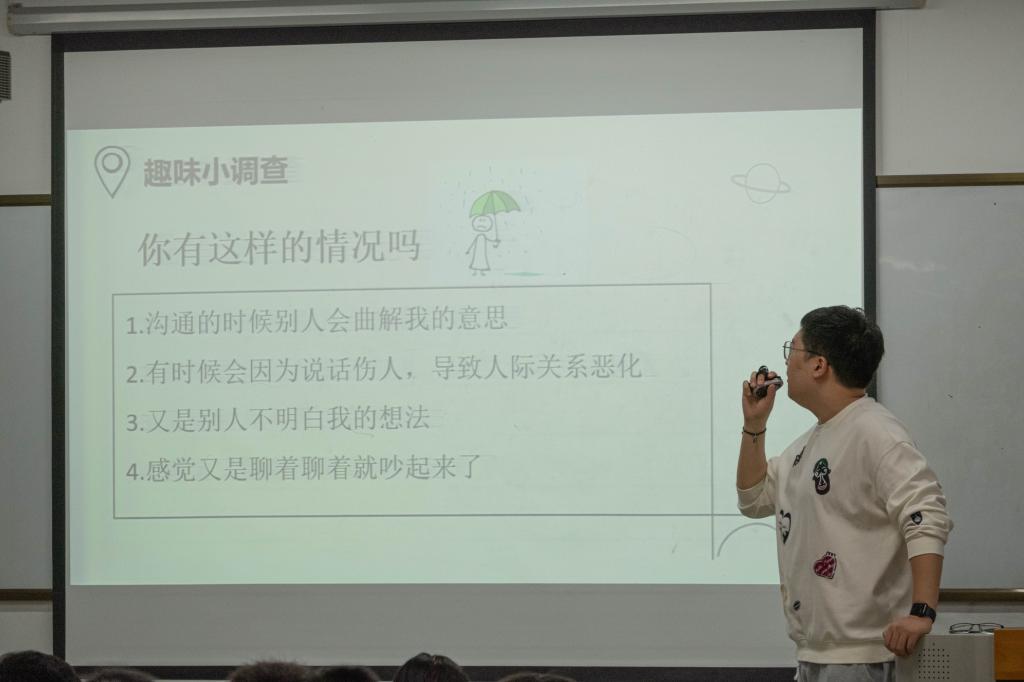 为引导大一新生关注自我精神健康,提高心理健康意识,2023年10月11日晚,bat365正版唯一官网特邀心理测评中心的张书宇老师面向2023级新生在5教416开展主题为“人际沟通——非暴力沟通”的讲座活动,帮助新生树立正确的精神健康观念,促进身心健康协调统一。本次活动由23级辅导员曾楠葳主持。